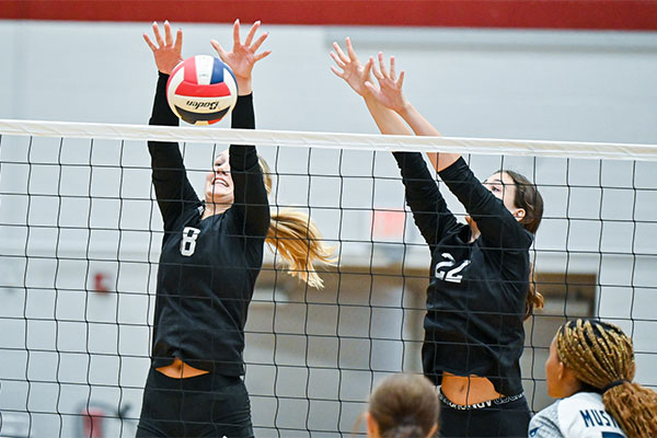 Rylee Unruh and Ella Roberts bolster the net for Free State. (Photo: David Rainey, @photorainey)