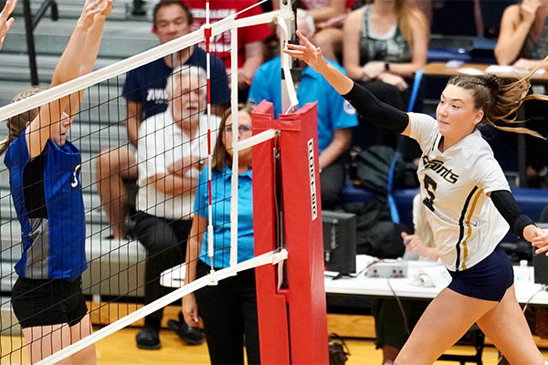 Grace Martin makes a play at the net for the Saints. (Photo: AJ Hildreth)