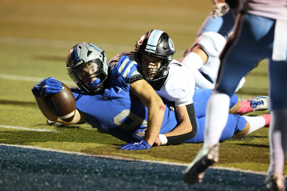 Josh Foland stretches for a touchdown in Olathe West's 37-28 win over Shawnee Mission East on Friday night. (Photo: Darryl Woods, 810 Varsity)