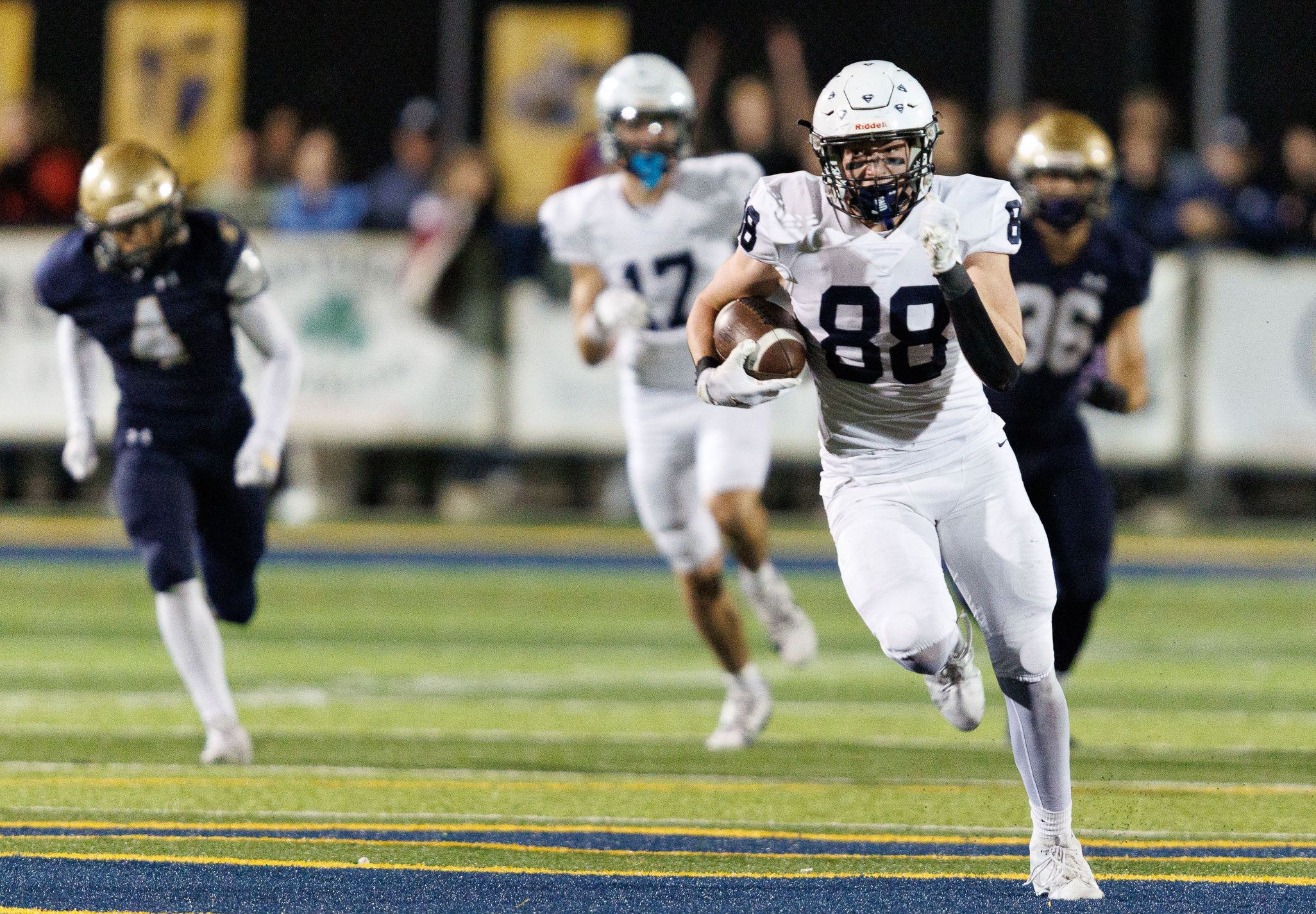 Stone Zambo caught three passes for 100 yards in Mill Valley's 28-27 win over St. Thomas Aquinas in the Kansas Class 5A second round on Friday night. (Photo: Darryl Woods, 810 Varsity)