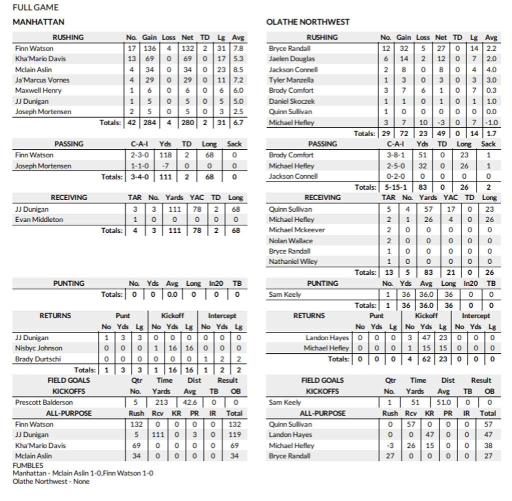 From there, Manhattan controlled both sides of the ball with 280 rushing yards while allowing just 49 rushing yards to Northwest, and yielding just 132 total yards on the cold, windy day.